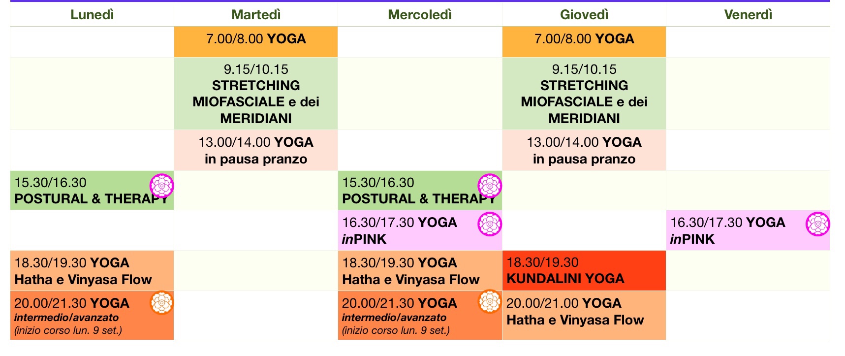 - PINK: per le donne in gravidanza e per le donne in genere. Esercizi per il pavimento pelvico, tecniche di respirazione e rilassamento, Asana che aiuteranno a scaricare le gambe e la colonna vertebrale. Asana di apertura del bacino e allungamento della muscolatura.